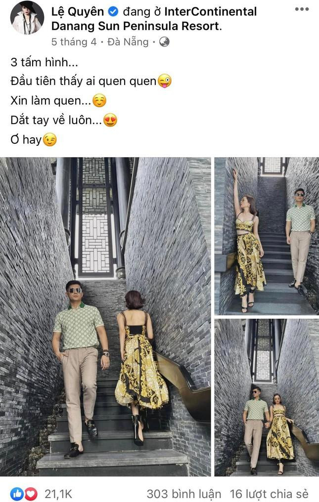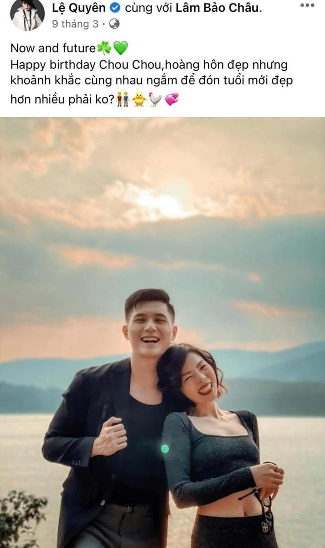 Sau một khoảng thời gian nhận về nhiều đồn đoán thì cuối cùng, đầu năm 2021 Lệ Quyên cũng đã thừa nhận mối quan hệ tình cảm với người mẫu Lâm Bảo Châu. Sau đó, "nữ hoàng phòng trà" thường xuyên chia sẻ những hình ảnh tình tứ bên bạn trai lên mạng xã hội bất chấp việc cô thường bị anti-fan cười nhạo.