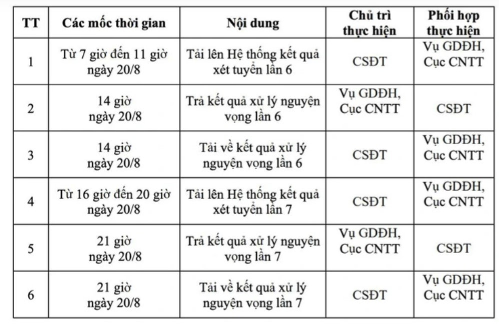 Trước 17h ngày 24/8, các cơ sở đào tạo nhập mức điểm trúng tuyển và kết quả xét tuyển lên hệ thống; Rà soát và chuẩn bị công bố kết quả trúng tuyển đợt 1 theo lịch chung.