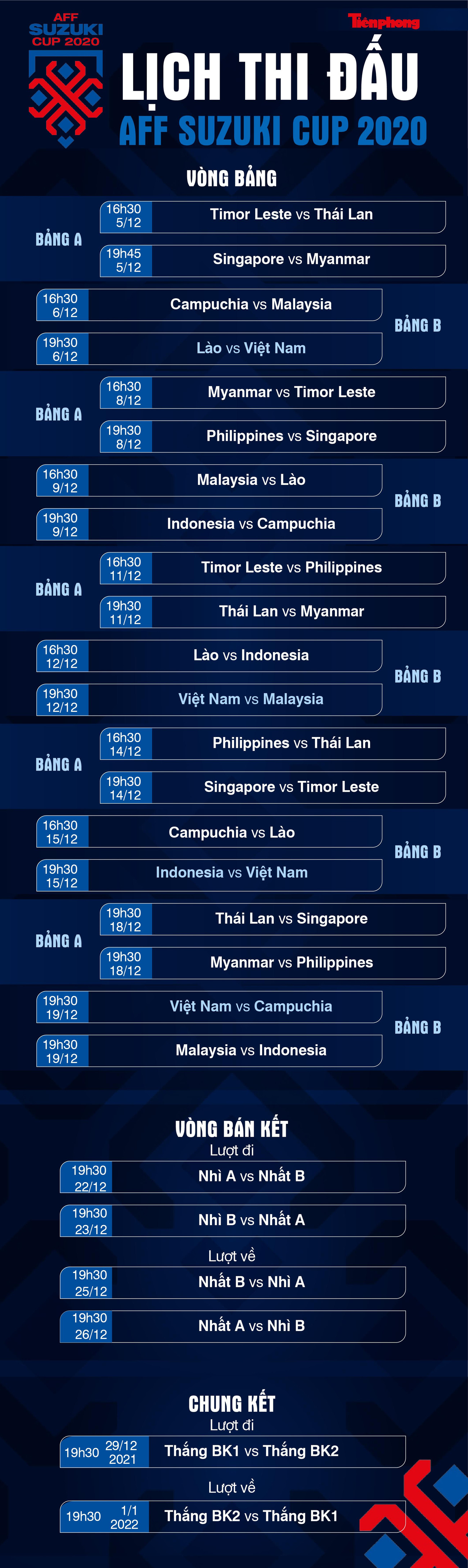 TPO - Lịch thi đấu chính thức toàn bộ các trận đấu của AFF Suzuki Cup 2020, diễn ra tại Singapore từ 5/12/2021 đến 1/1/2022. Thầy trò HLV Park Hang-seo đứng trước cơ hội lớn bảo vệ thành công ngôi vô địch.