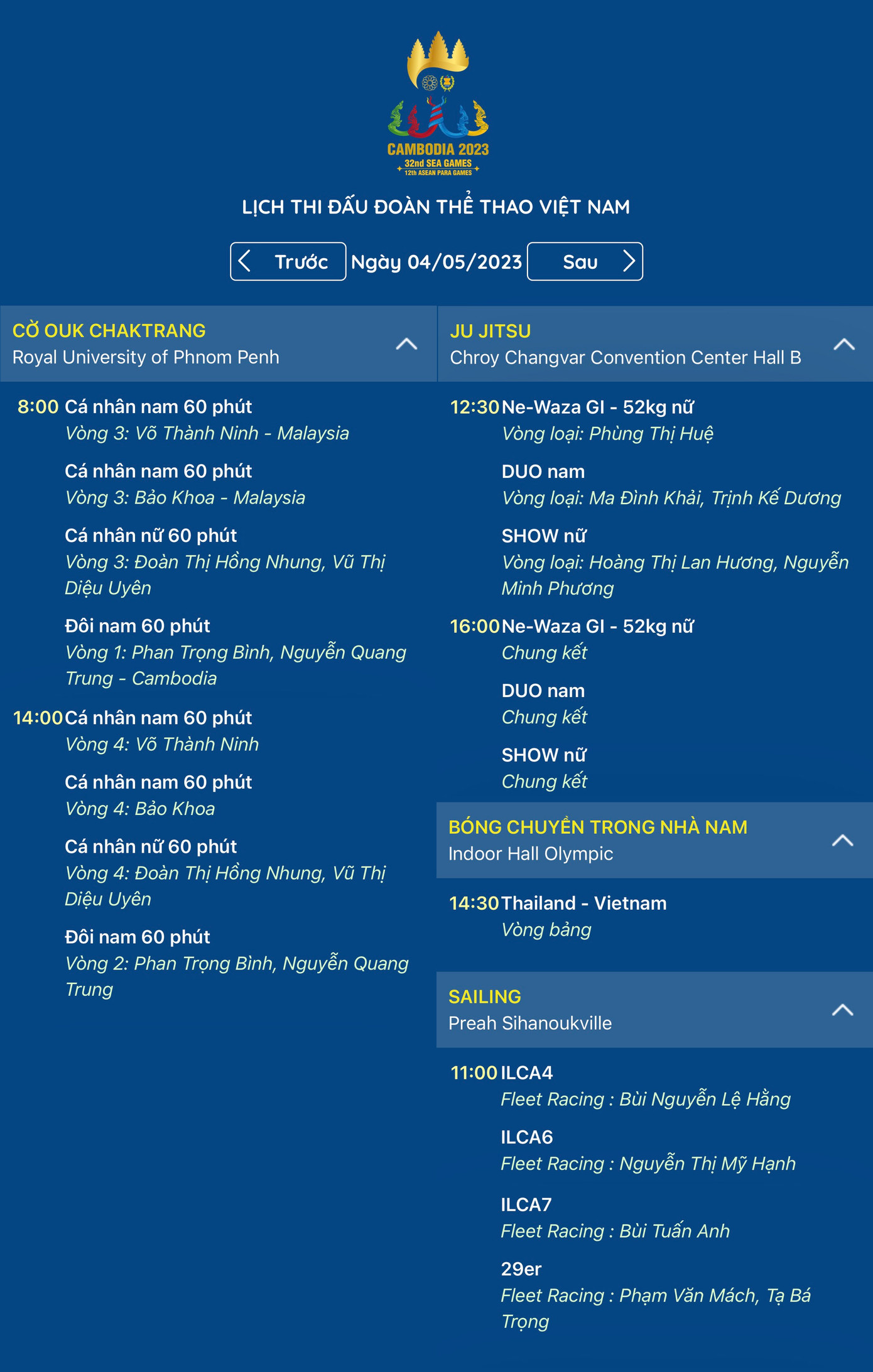 Trong ngày thi đấu 4/5, đoàn thể thao Việt Nam tiếp tục thi đấu các nội dung cờ ouk Chaktrang truyền thống của Campuchia, thuyền buồm, võ Jiu Jitsu và bóng chuyền nam. Chúng tôi sẽ cập nhật kết quả thi đấu của đoàn thể thao Việt Nam trong những bản tin mới nhất.