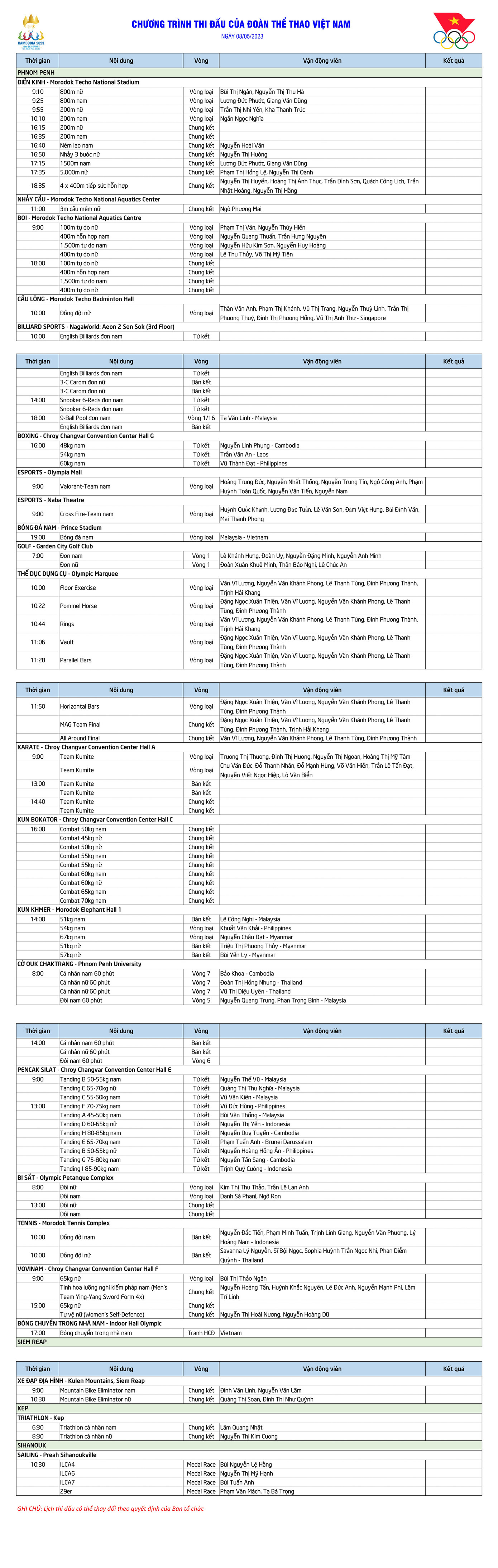 SEA Games 32 được tổ chức tại Campuchia, khai mạc vào ngày 5/5 và bế mạc vào ngày 17/5. SEA Games 32 sẽ có 37 môn với 583 nội dung, trong đó có 36 môn tính huy chương và một môn trình diễn Teqball. Trong số này có 21 môn Olympic, chiếm 56,8%.