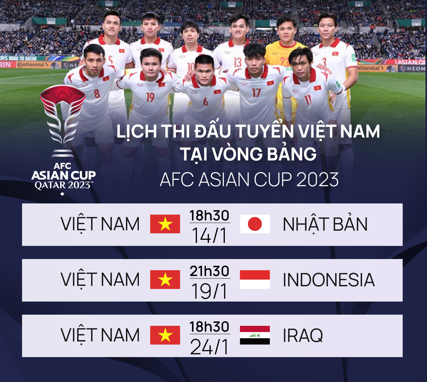 Trận đấu mở màn của đội tuyển Việt Nam gặp đội tuyển Nhật Bản trong khuôn khổ bảng D Asian Cup 2023 sẽ diễn ra vào lúc 18h30 ngày 14/1/2024 theo giờ Việt Nam trên SVĐ Al Thumama, Doha.