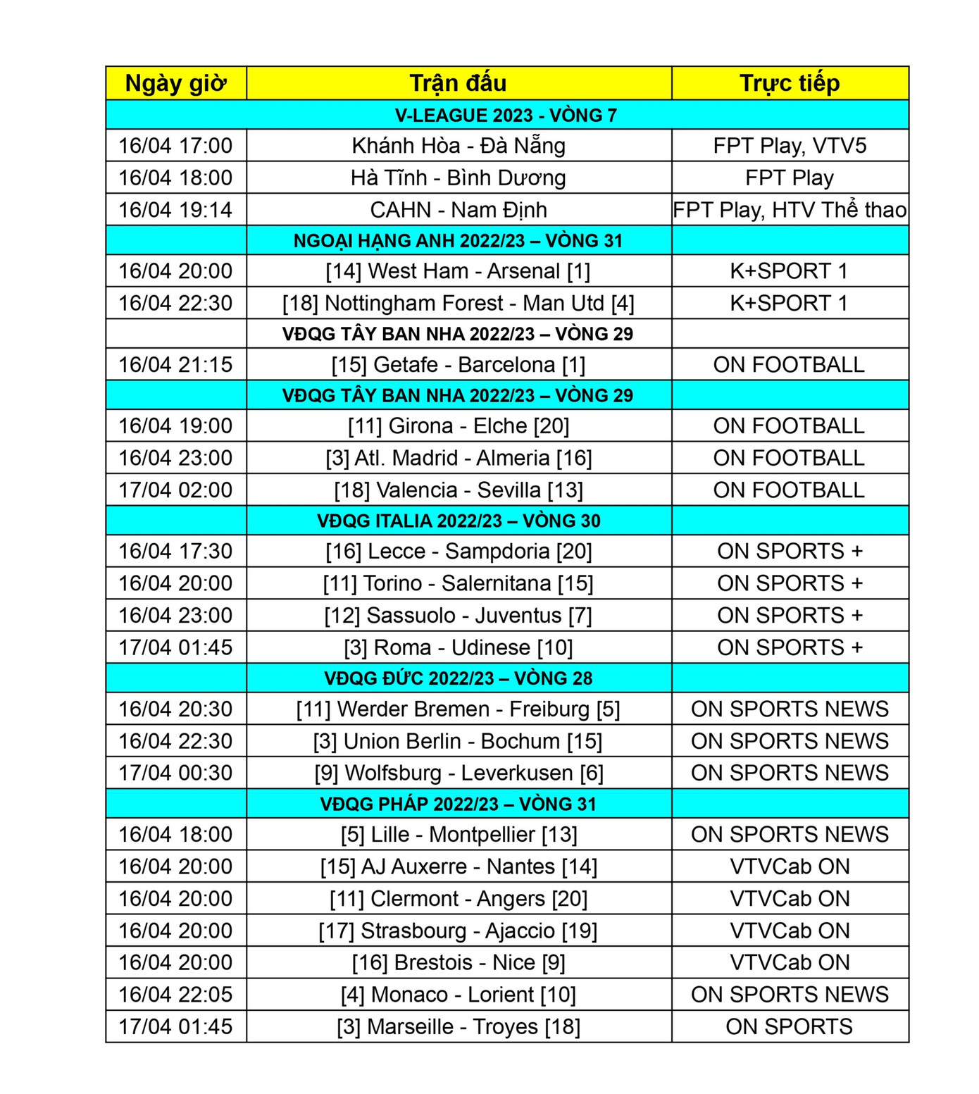 Tại vòng 7 V-League 2023, trận đấu đáng chú ý trong ngày thi đấu 16/4 là cuộc so tài giữa CAHN và Nam Định. Ngoài ra, còn có các trận đấu giữa Khánh Hòa và Đà Nẵng, Hà Tĩnh và Bình Dương.