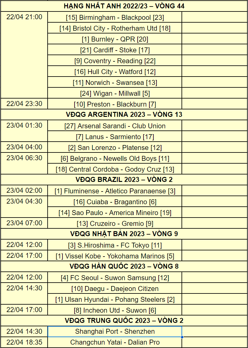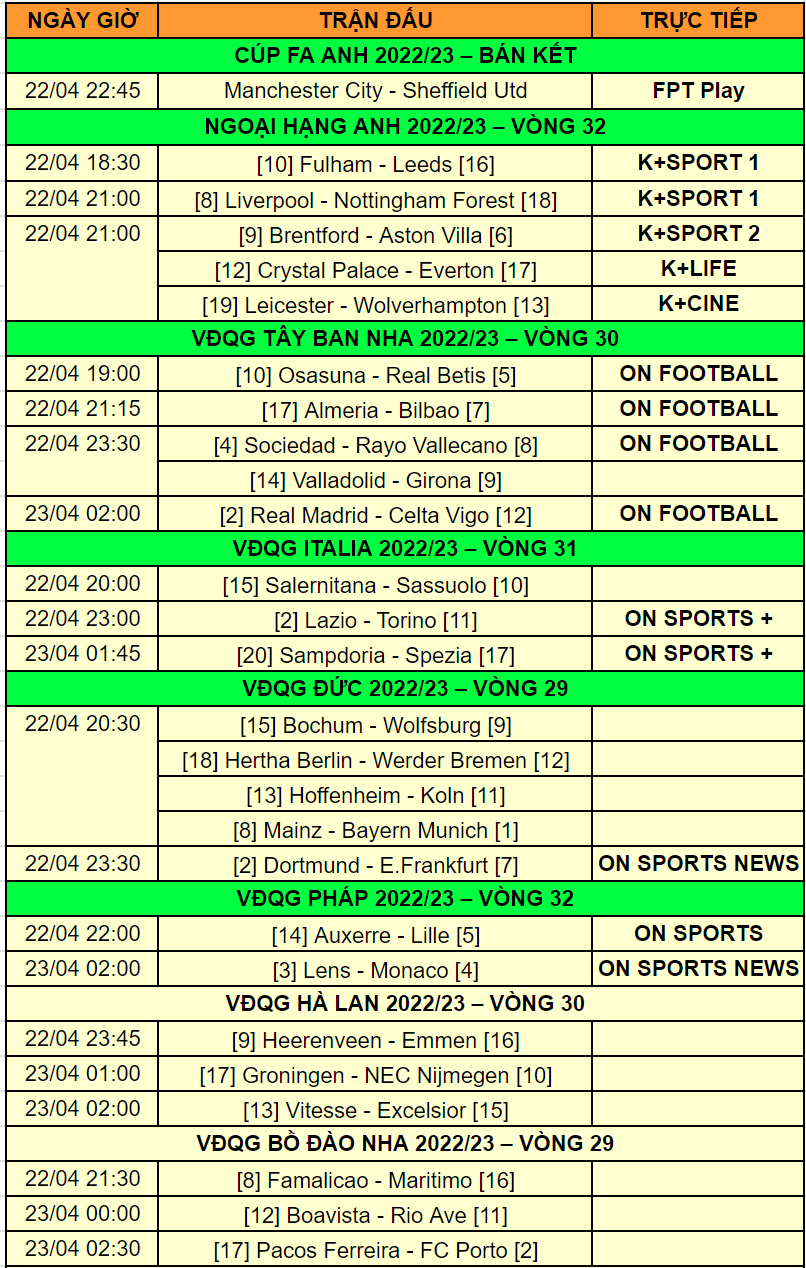 Lịch thi đấu và trực tiếp bóng đá hôm nay 22/4