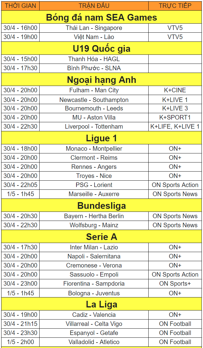 Lịch thi đấu và trực tiếp bóng đá hôm nay 30/4