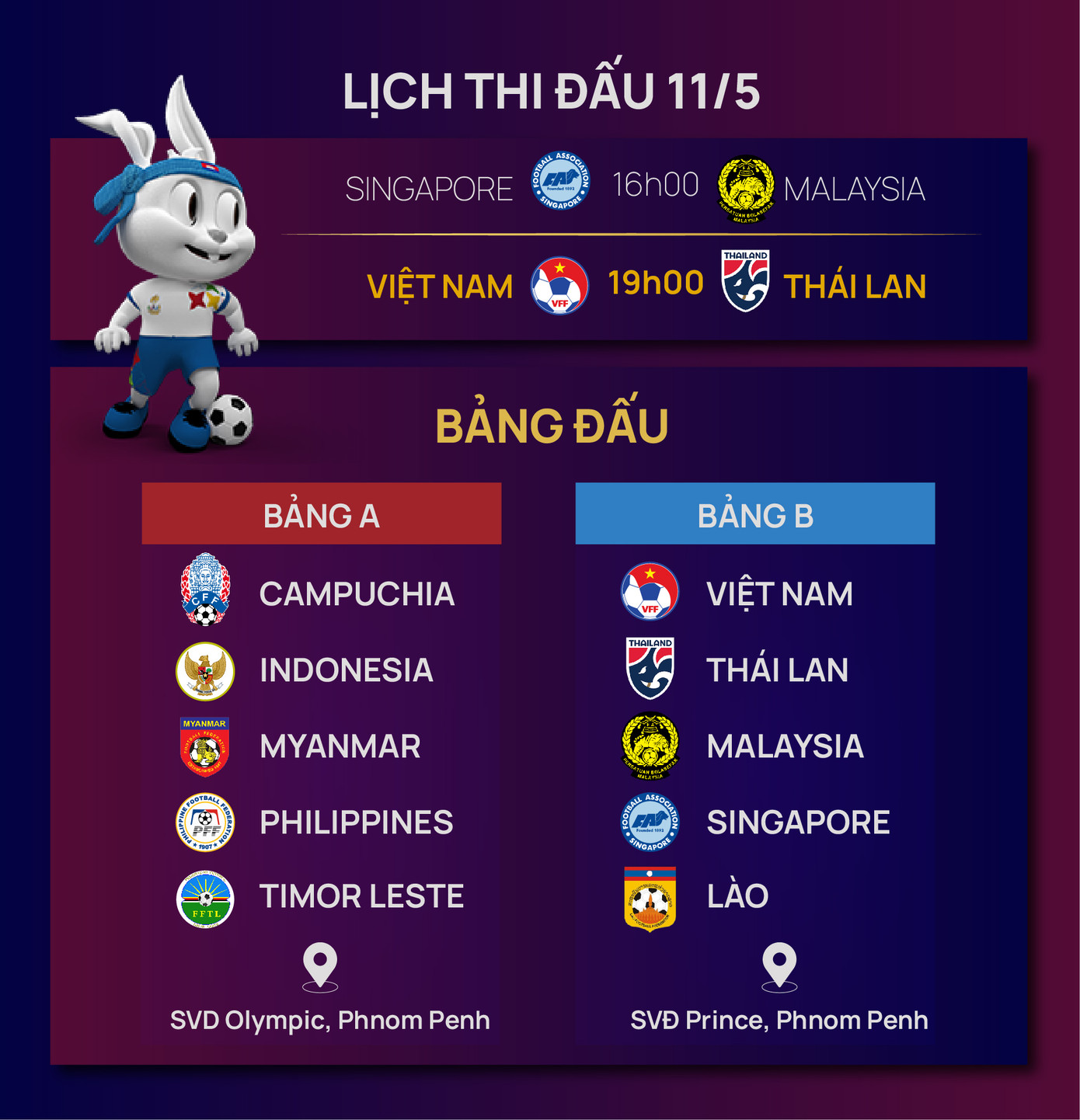 Trong khi đó, bảng A gồm các đội tuyển U22 Campuchia, Indonesia, Myanmar, Philippines và Timor Leste.
