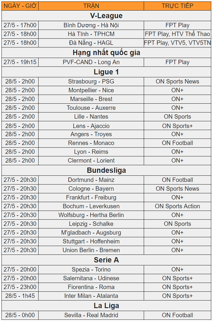 Lịch thi đấu và trực tiếp bóng đá ngày 27/5