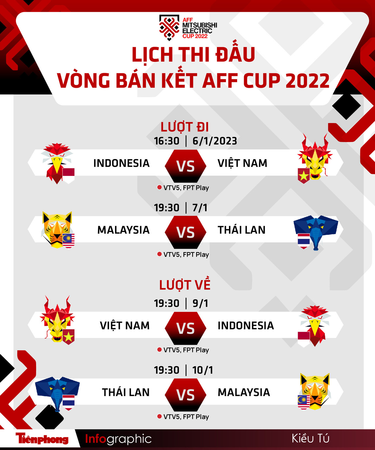 TPO - AFF Cup 2022 đã xác định 2 cặp đấu ở vòng bán kết: Việt Nam (nhất bảng B) đụng độ Indonesia (nhì bảng A); Thái Lan (nhất bảng A) gặp Malaysia (nhì bảng B). Vòng bán kết diễn ra theo thể thức lượt đi và về. ĐT Việt Nam có lợi thế khi được đá trận lượt về trên sân nhà.