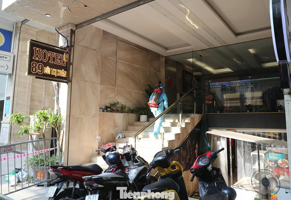 | Lực lượng chức năng tiến hành lập hàng rào phong tỏa, phun khử khuẩn các khu vực trong và ngoài khách sạn. Ảnh: Như Ý |