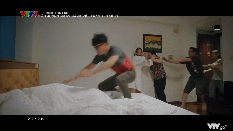 - Xuất hiện khá ít nhưng nhân vật Liên đã có hai tình huống đặc biệt oái oăm, đó là cảnh bị Đức (Hồng Đăng) trùm chăn đánh túi bụi hay cảnh nhảy lên nắp capo xe hơi đánh ghen. Có câu chuyện hậu trường thú vị nào chị muốn kể cho khán giả?