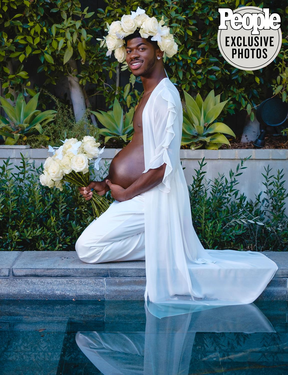 Hôm nay 3/9, Lil Nas X đã chia sẻ một số bức ảnh chụp độc quyền cho tạp chí People trên trang cá nhân. Trong đó, bức ảnh nam ca sĩ thướt tha trong bộ trang phục trắng, đầu đội vòng hoa hồng, tay ôm bụng bầu khiến nhiều người choáng váng.