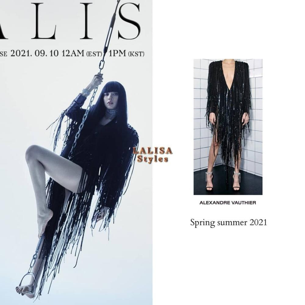Trong bức ảnh nhá hàng mới nhất, Lisa mặc trang phục thuộc BST Xuân Hè 2021 dòng cao cấp Haute Couture của nhà mốt ALEXANDRE VAUTHIER. Nữ idol đu mình trên chiếc dây xích sắt, tư thế giúp khoe đôi chân dài đỉnh cao.