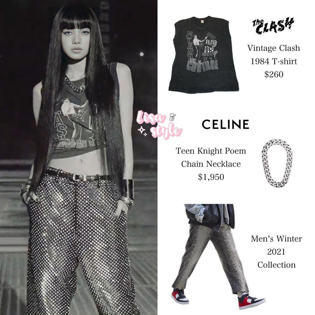 Lisa mặc chiếc thun có kiểu dáng vintage của The Clash, cô đeo vòng cổ và mặc chiếc quần sequin lấp lánh của thương hiệu CELINE. Chiếc vòng cổ dây xích to bản nam tính và kiểu dáng đơn giản có giá lên tới hơn 44 triệu đồng.