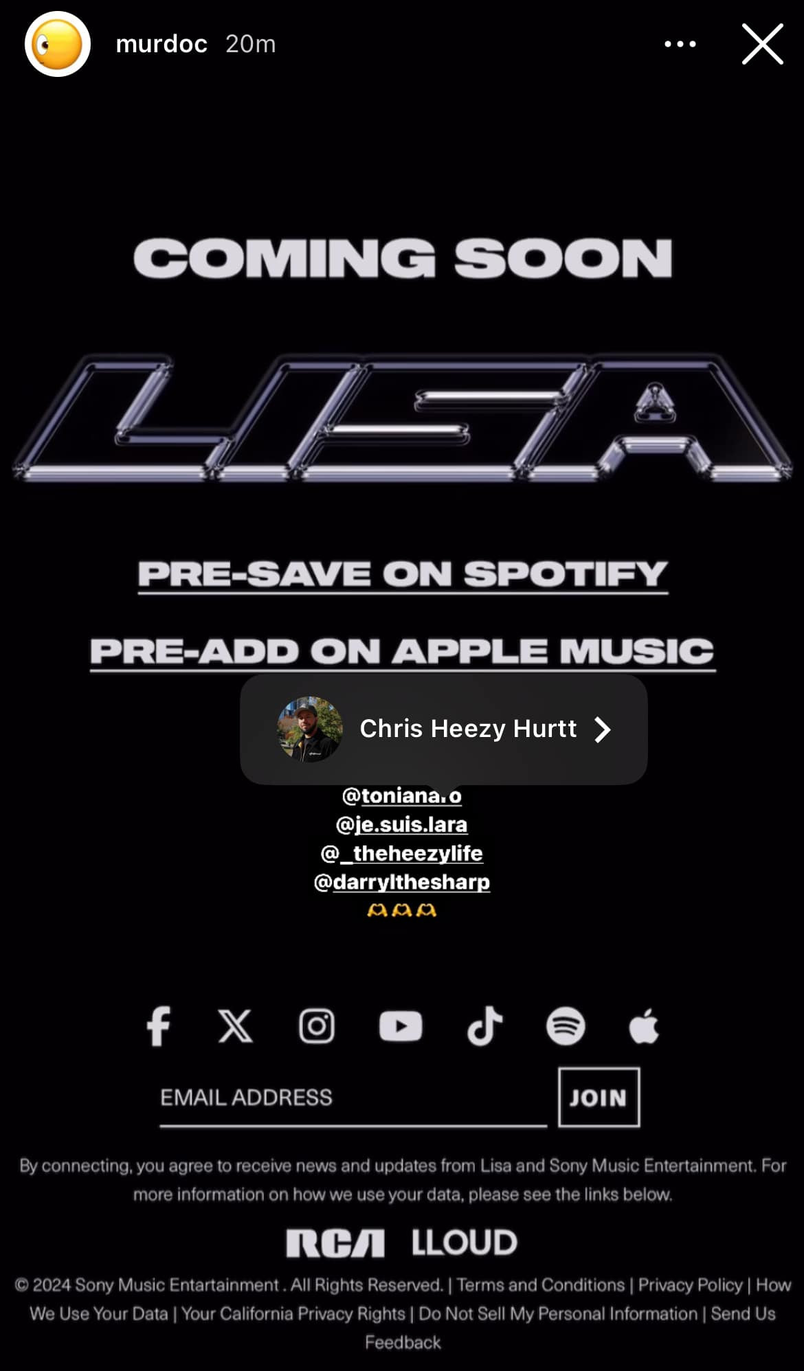 Một trong những tài khoản đáng chú ý là của Chris Heezy Hurtt - người đứng sau phần hình ảnh cho album SOS của SZA, tức là Chris sẽ góp công trong hiệu ứng hình ảnh ở sản phẩm sắp tới của Lisa. Màn kết hợp này bất ngờ nhưng không lạ, bởi anh là motion design director của RCA Records - hãng thu mà LLOUD đã xác nhận hợp tác.