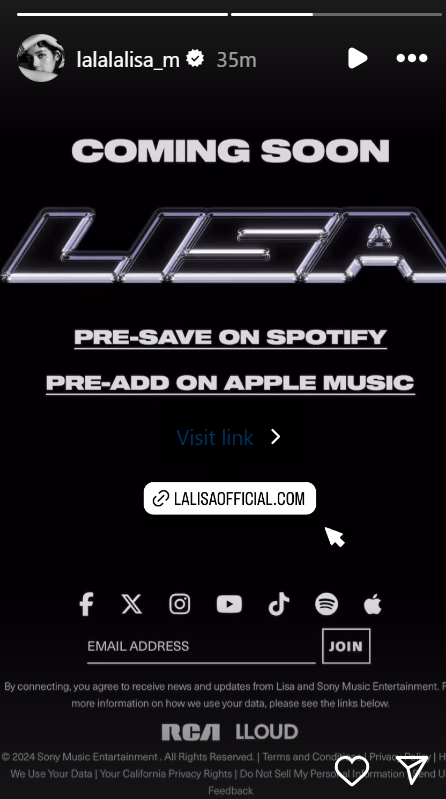 Mới đây, Lisa đăng thông báo "coming soon", báo trước về một dự án sắp được công bố. Cùng với các từ khóa như "pre-save on Spotify", "pre-add on Apple Music", chắc chắn điều Lisa sắp tuyên bố chính là sản phẩm âm nhạc mới.