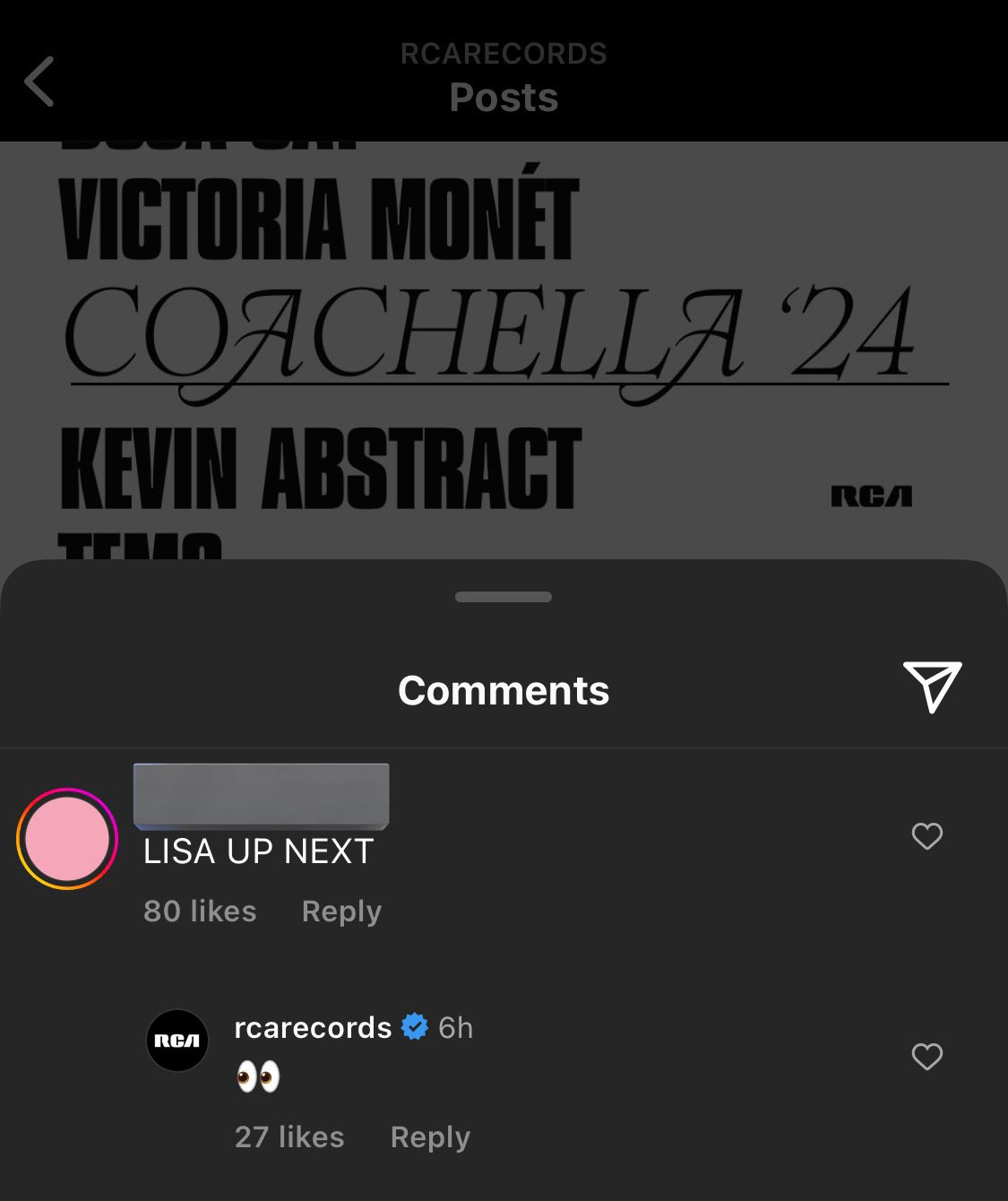 Ngoài ra, khi hãng thu âm RCA đăng lịch biểu diễn của các nghệ sĩ hợp tác tại Coachella 2024, một fan đã bình luận ở dưới "Lisa up next" (tiếp theo là Lisa nha). RCA đã trả lời bằng một icon hình đôi mắt trông ngóng. Người hâm mộ nghi ngờ đây là "hint" từ RCA về sự hiện diện của "búp bê sống" BLACKPINK tại lễ hội âm nhạc lớn nhất hành tinh này.