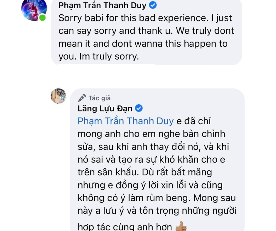 Thế nhưng, chỉ sau vài phút đăng tải, bài viết này đã "bay màu" trên trang cá nhân của Lăng LD. Thanh Duy sau đó đã gửi lời xin lỗi đến nam rapper vì sự thiếu sót trong khâu quản lý và tổ chức liveshow của mình: "We truly don't mean it and don't wanna this happen to you. I'm truly sorry" (tạm dịch: Anh và ê-kíp hoàn toàn không cố ý và đây là sự cố ngoài ý muốn. Chân thành xin lỗi em).