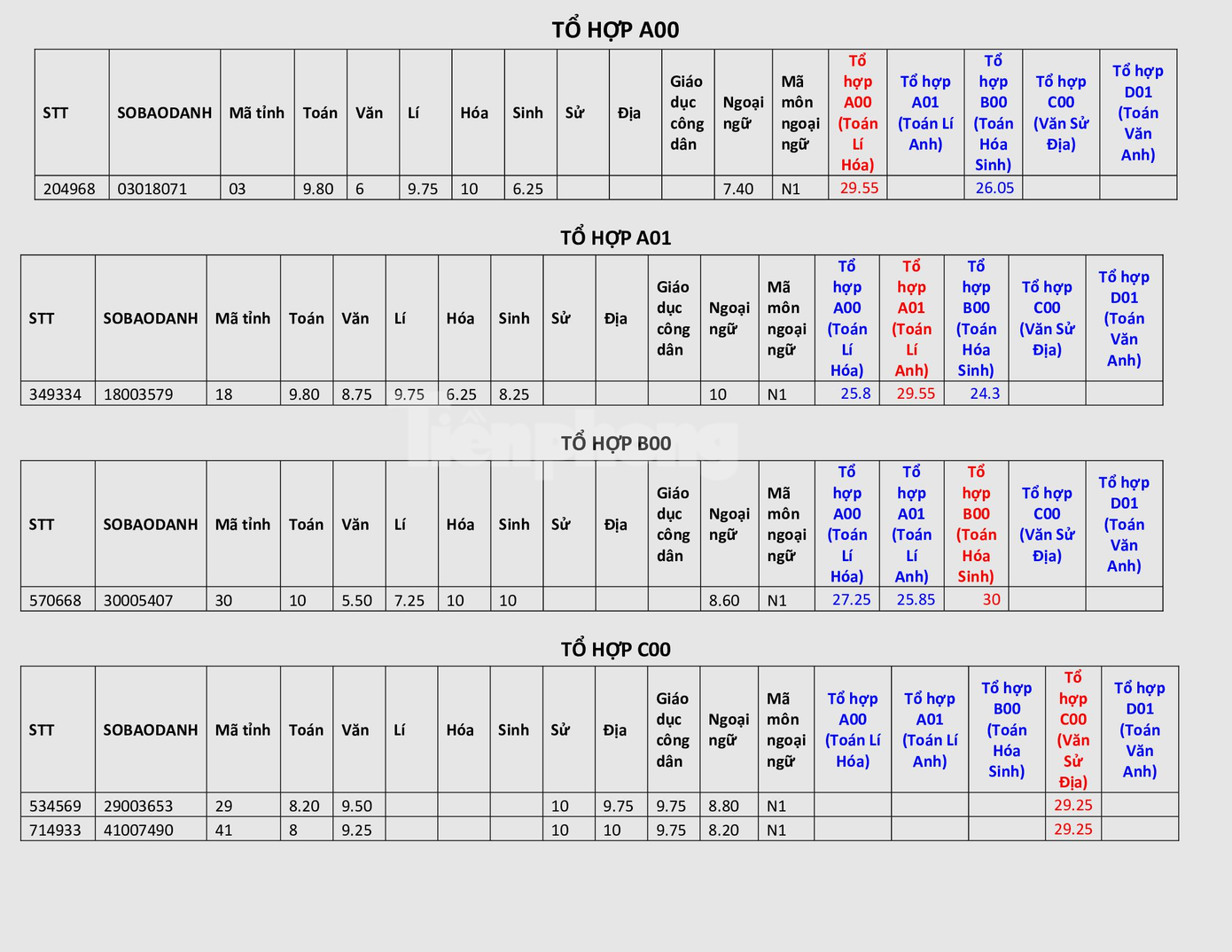 Tổ hợp C00 có 2 thủ khoa cùng đạt 29,25 điểm. Trong đó, có 1 thủ khoa đến từ Nghệ An với Văn 9,5; Sử 10; địa 9,75. Thủ khoa còn lại đến từ tỉnh Khánh Hòa với Văn 9,25; Sử 10, Địa 10.