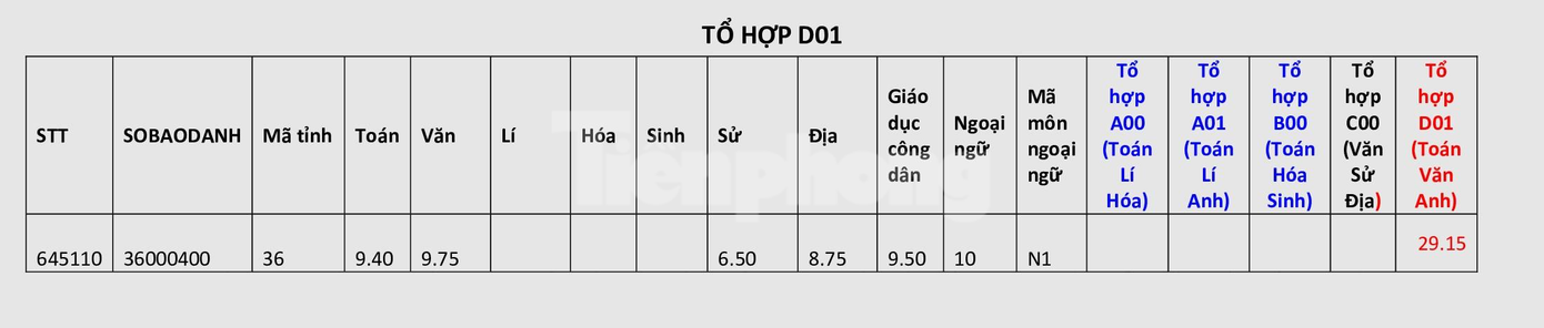 Thủ khoa tổ hợp D01 (Toán, Văn, tiếng Anh) đến từ tỉnh Kon Tum với Toán 9,4; Văn 9,75 và tiếng Anh 10, tổng điểm là 29,15 điểm.
