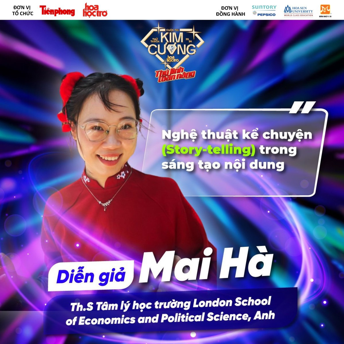 Nghệ thuật kể chuyện (Storytelling) trong sáng tạo nội dung cũng là lớp học siêu hot của Thử Thách Kim Cương. Teen sẽ được hướng dẫn chi tiết bởi chị Mai Hà (Th.S Tâm lý học London School of Economics and Political Science, Anh) cách kể chuyện sao cho thật thu hút, hấp dẫn mà khiến ai nghe cũng “ồ quao”. Kỹ thuật này sẽ giúp cho bạn trở thành nhà sáng tạo nội dung cực xịn, không lo bị thiếu content hay bí ý khi làm nội dung truyền thông đến công chúng.