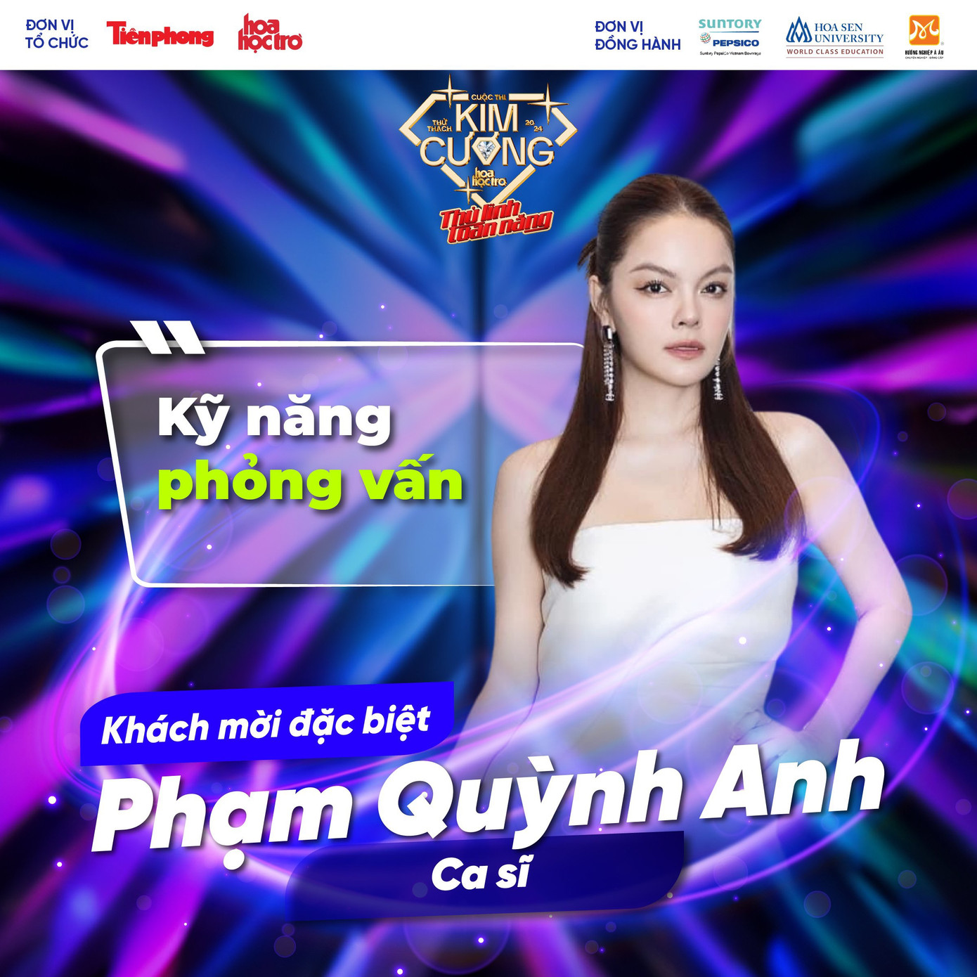 “Nóng hôi hổi” tại ngay chính Thử Thách Kim Cương, anh Tuấn Đức còn mời đến khách mời đặc biệt là chị ca sĩ Phạm Quỳnh Anh nữa đó! Các bạn thí sinh sẽ có cơ hội được trực tiếp phỏng vấn, “thực chiến” các kiến thức đã học để trò chuyện với chị. Quá đã!