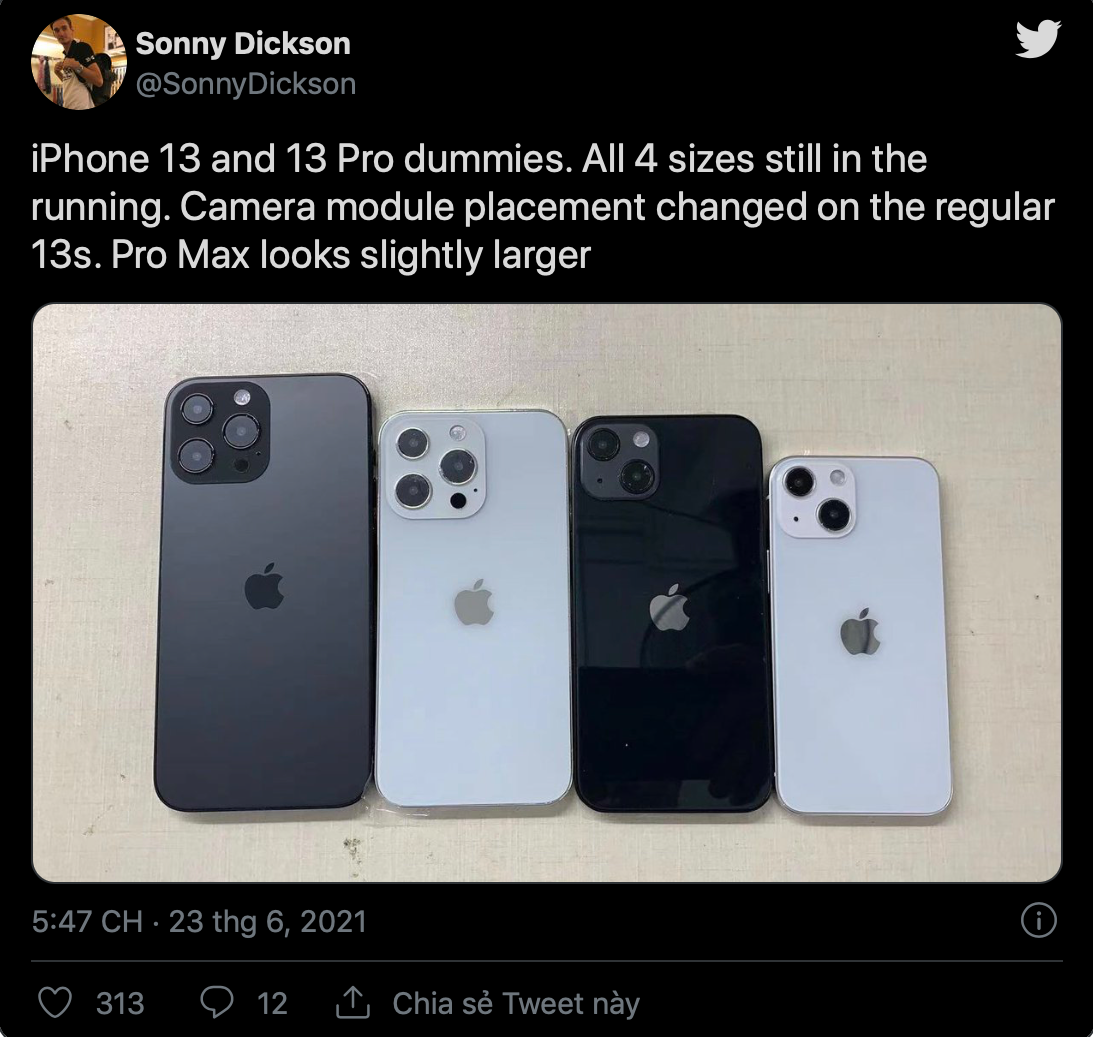 Sonny Dickson xác nhận Apple sẽ ra mắt 4 mẫu iPhone mới trong năm 2021: iPhone 13 mini, iPhone 13, iPhone 13 Pro và iPhone 13 Pro Max. Mặc dù iPhone 12 mini không mang về doanh thu tốt như dự kiến, nhưng nhà Táo vẫn sẽ tung ra iPhone 13 mini trong sự kiện tháng 9 tới.