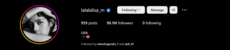 Mới đây, người hâm mộ Lisa đã cùng ăn mừng khi tài khoản Instagram của cô nàng vượt mốc 90 triệu lượt theo dõi. Nàng main dancer của BLACKPINK là idol K-Pop đầu tiên và duy nhất hiện tại đạt được thành tích này. Ngoài ra, Lisa cũng là người nổi tiếng Thái Lan sở hữu nhiều lượt theo dõi nhất, người nổi tiếng châu Á thứ ba (sau vận động viên cricket người Ấn Độ - Virat Kohli và diễn viên/ người mẫu Gal Gadot) có nhiều lượt follower nhất.