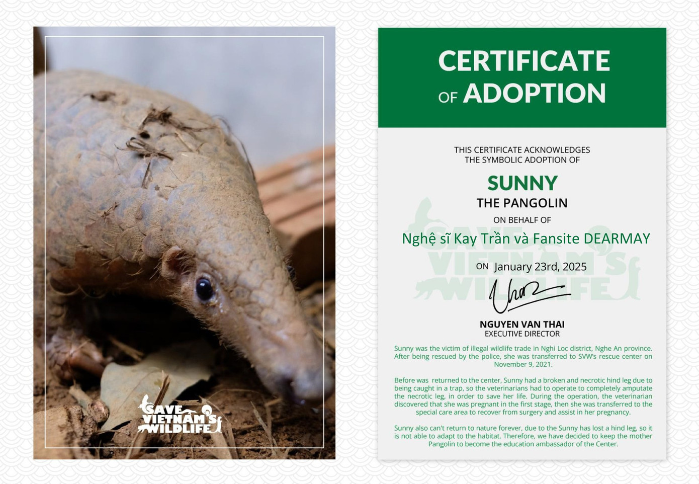 Đầu năm nay, DEARMAY còn đứng ra nhận bảo trợ cho một bé tê tê đáng yêu tên là Sunny trong Trung tâm Bảo tồn Động vật Hoang dã tại Việt Nam - dưới danh nghĩa Kay Trần.