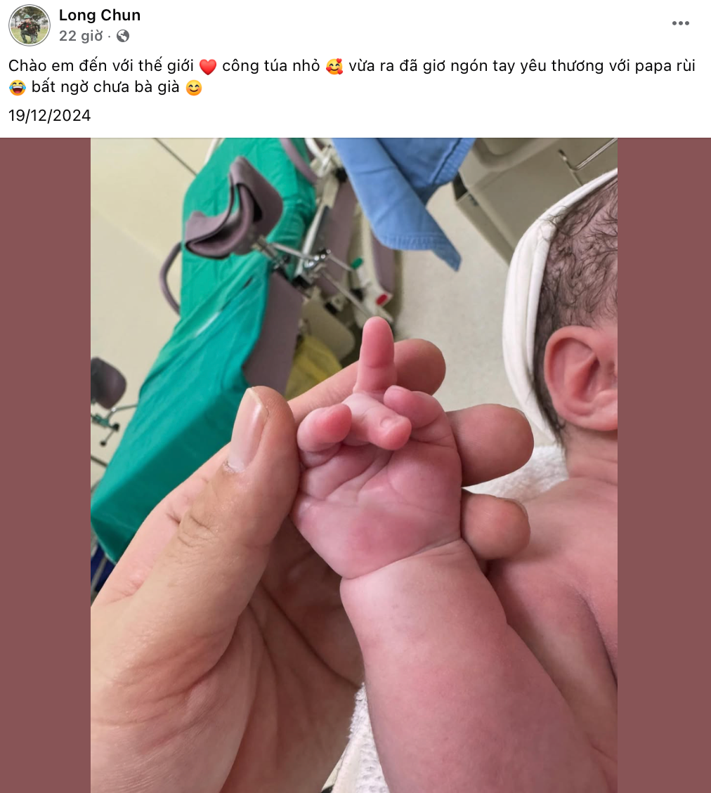 Mới đây, cộng đồng mạng được dịp bất ngờ khi Long Chun công khai đón con gái đầu lòng, anh đăng tải bức hình nắm tay em bé vừa chào đời kèm nội dung: "Chào em đến với thế giới công chúa nhỏ, vừa ra đã giơ ngón tay yêu thương với papa rùi. Bất ngờ chưa bà già, 19/12/2024".