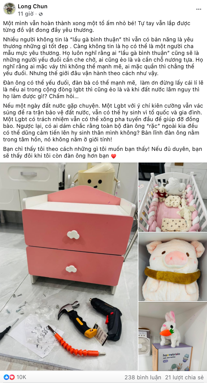 Khi có nhiều cư dân mạng để lại bình luận trái chiều, Long Chun đăng ảnh tự ghép nôi cho con trên trang cá nhân và đáp lại cực gắt: "Một mình vẫn hoàn thành xong một tổ ấm nhỏ bé! Tự tay vẫn lắp được từng đồ vật đong đầy yêu thương...". Thậm chí trong phần đáp trả này, Long Chun còn khẳng định: "Đôi khi tôi còn đàn ông hơn bạn".