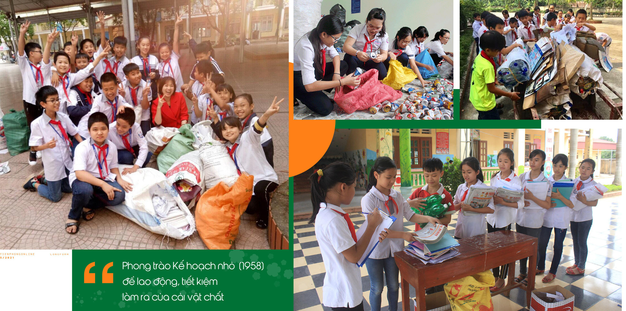 Phong trào “Kế hoạch nhỏ” (1958) để lao động, tiết kiệm làm ra của cải vật chất như xây dựng Nhà máy nhựa Thiếu niên Tiền phong (1959 đi vào hoạt động), Đoàn tàu lửa chạy trên đường sắt Thống Nhất (1979), Khách sạn Khăn quàng đỏ (1987)... và hàng nghìn công trình khác ở các địa phương đã tạo nên những cơ sở vật chất văn hóa cho thiếu nhi và xã hội. Phong trào xây dựng Hợp tác xã Măng non, lập các quỹ “Vì bạn nghèo”, “Hỗ trợ tài năng trẻ”, quỹ Vừ A Dính, Đôrêmon, Giải thưởng Kim Đồng... đã thu hút hàng tỷ đồng nhằm giúp đỡ hàng triệu bạn có hoàn cảnh khó khăn có thêm điều kiện sinh hoạt và học tập, hoà nhập với cộng đồng. Các phong trào “Nói lời hay, làm việc tốt, phấn đấu trở thành con ngoan, trò giỏi, đội viên tốt, Cháu ngoan Bác Hồ”; phong trào “Hành quân theo bước chân những người anh hùng”, “Về với cội nguồn”, “Vì điểm tựa tiền tiêu”, “Áo lụa tặng bà”, “Địa chỉ nghĩa tình”... đã thu hút hàng triệu em tham gia. Thông qua các hoạt động đó, các em được tự rèn luyện và được giáo dục những truyền thống cách mạng, những phẩm chất tốt đẹp của dân tộc Việt Nam.