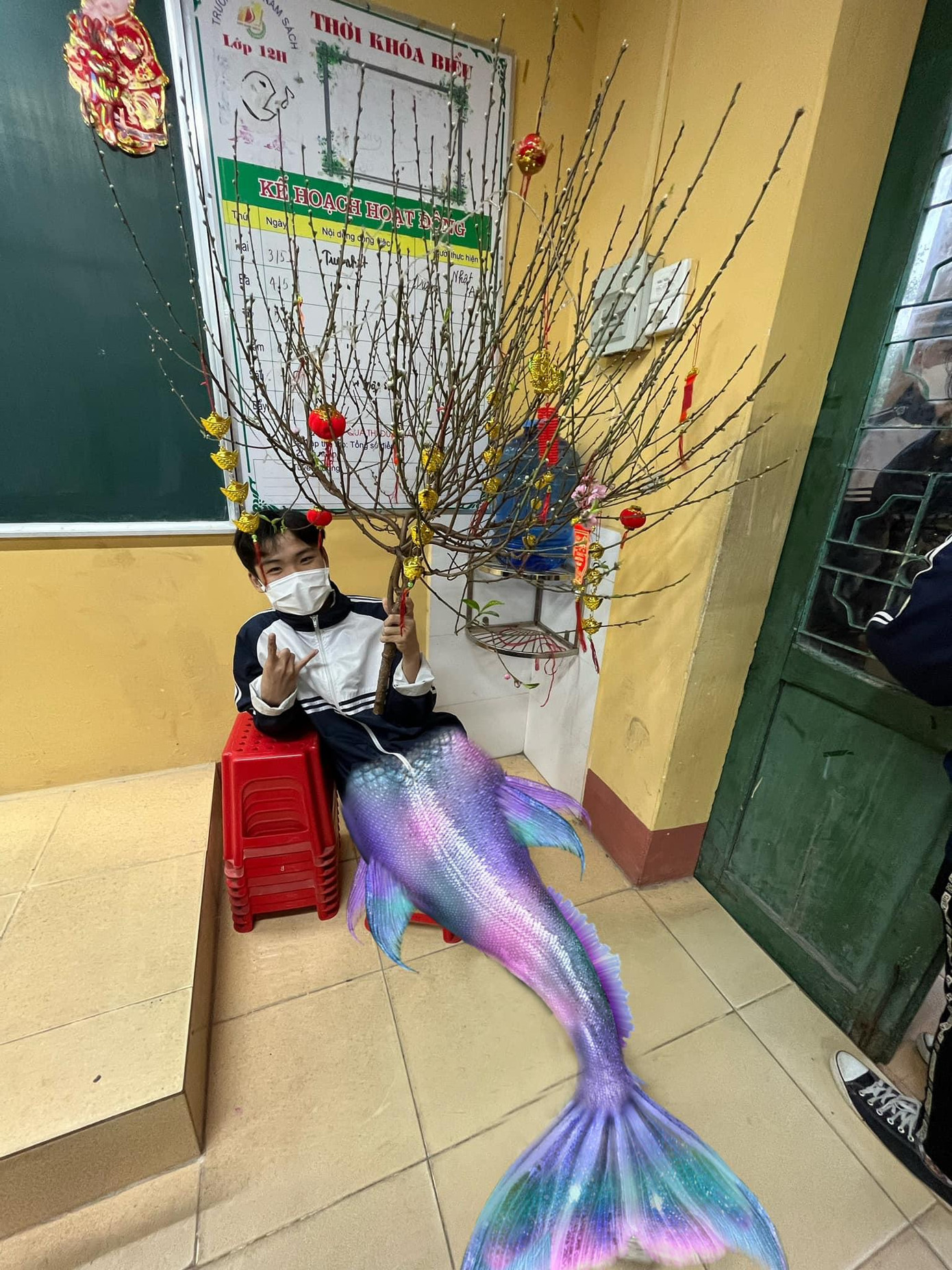 Thì ra đây là sản phẩm photoshop của hội bạn để "troll" nam sinh này. Bức ảnh gốc chỉ là hình ảnh cậu bạn ngồi trên ghế và check-in với cây đào của lớp mà thôi. Nhưng do cách mà cậu bạn ngồi khá giống nàng tiên cá nên các bạn đã tạo cho nam sinh một bất ngờ.