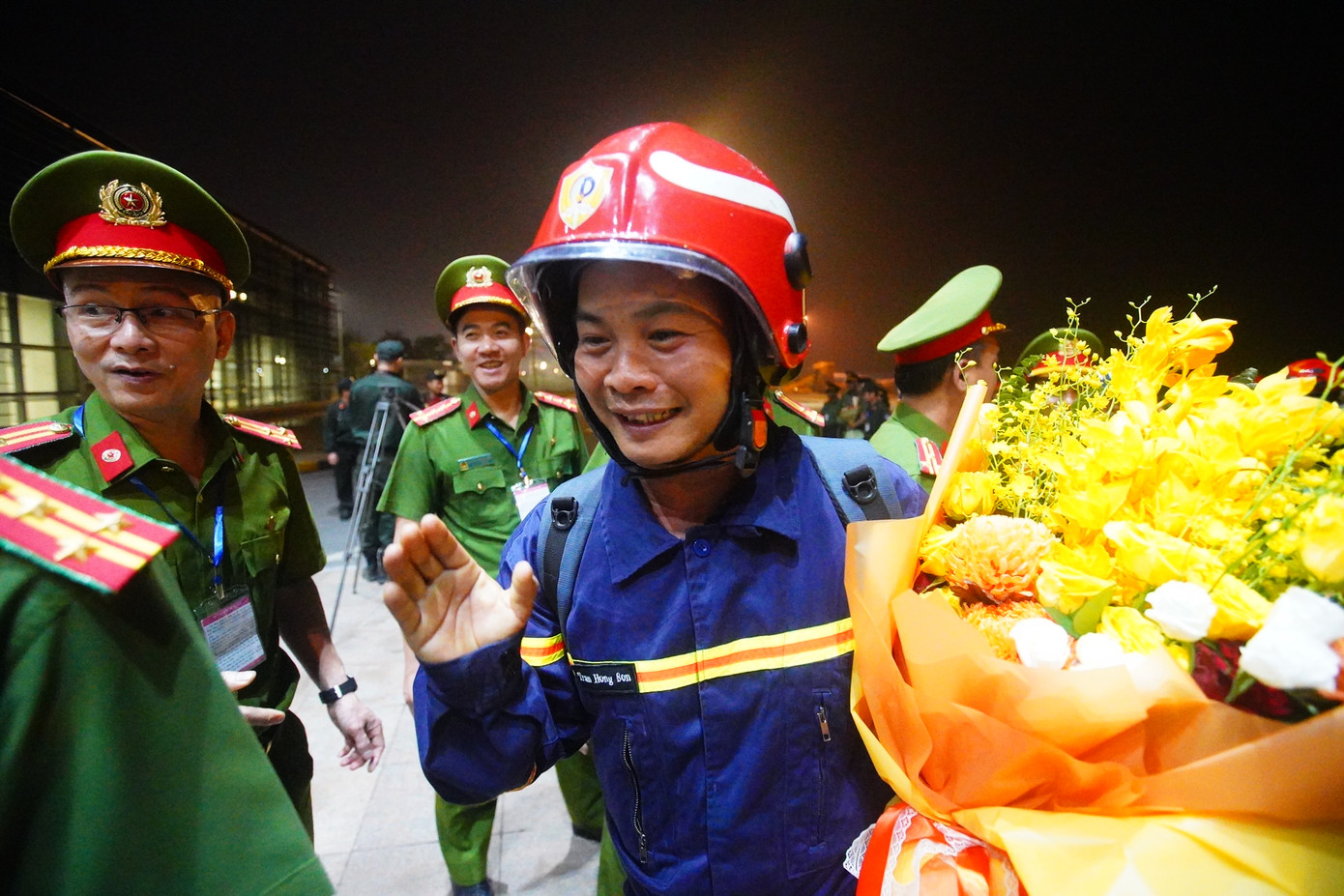 | Trung tướng Lê Văn Tuyến, Thứ trưởng Bộ Công an, tặng hoa lực lượng cứu hộ, cứu nạn. |