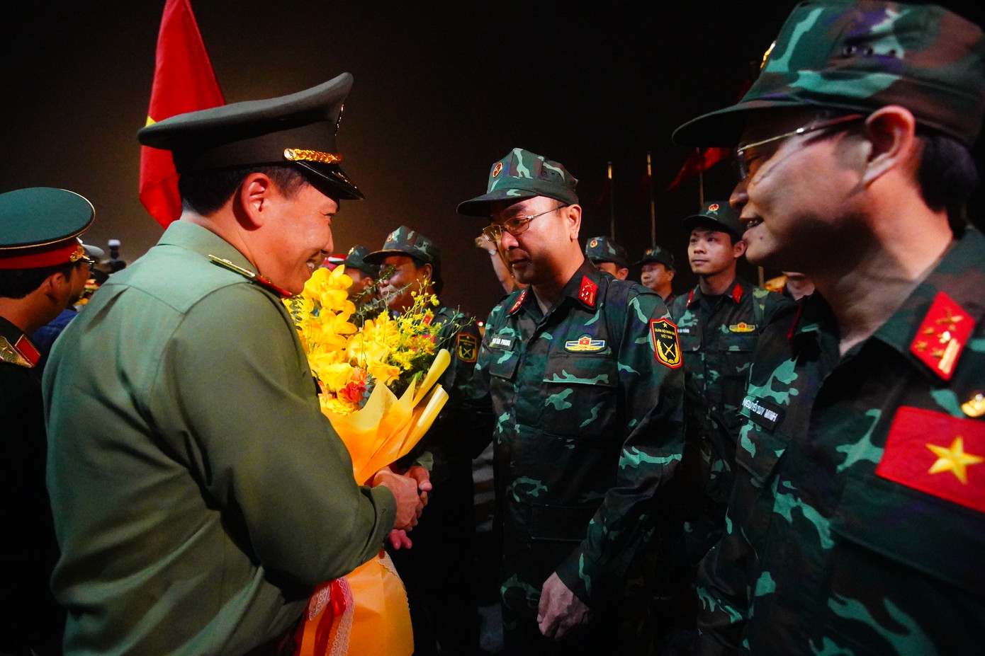 | Thứ trưởng Bộ Công an Lê Văn Tuyến tặng hoa các chiến sĩ. |