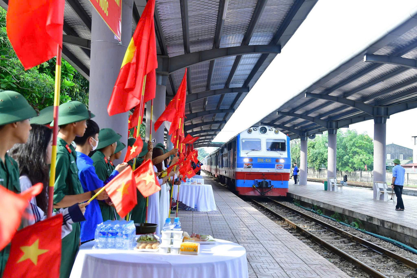 | Lãnh đạo Quân khu 4, UBND tỉnh Nghệ An đón lực lượng thực hiện nhiệm vụ diễu binh, diễu hành kỷ niệm 50 năm Ngày Giải phóng miền Nam, thống nhất đất nước tại ga Vinh. |