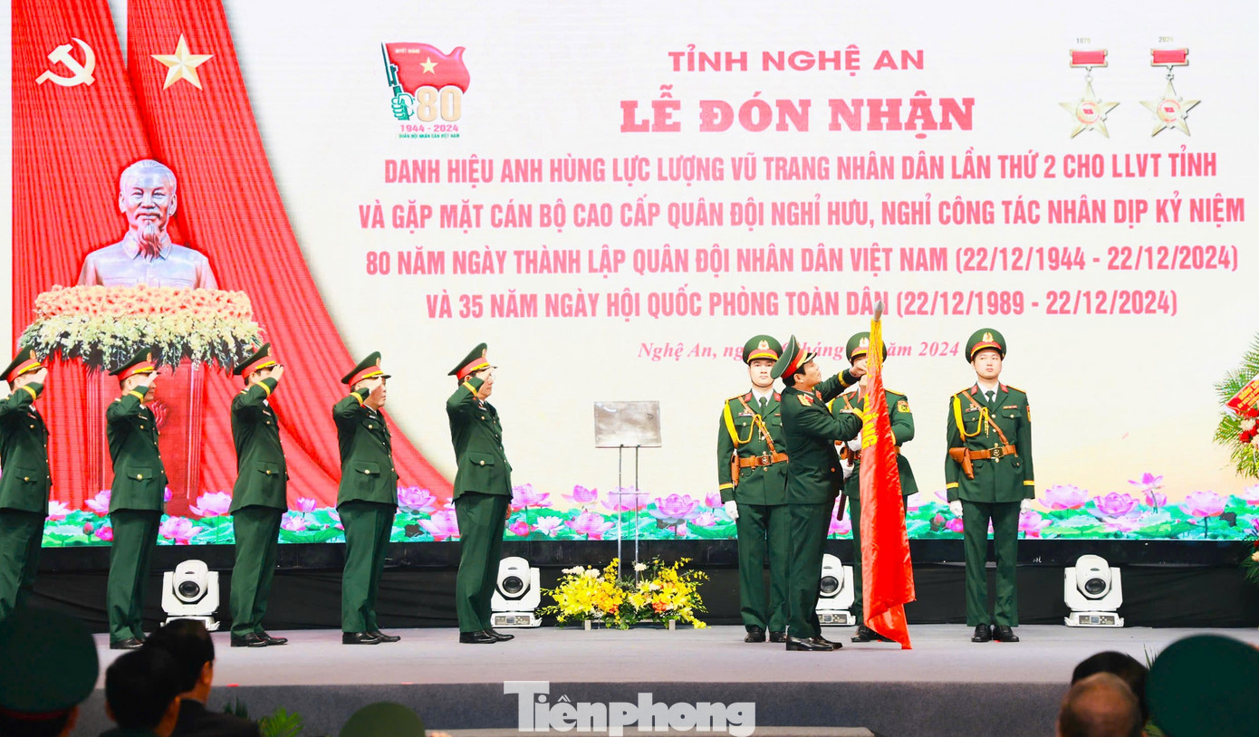 | Đại tướng Nguyễn Tân Cương - Ủy viên Ban Chấp hành Trung ương Đảng, Ủy viên Thường vụ Quân ủy Trung ương, Tổng Tham mưu trưởng QĐND Việt Nam, Thứ trưởng Bộ Quốc phòng trao danh hiệu Anh hùng Lực lượng vũ trang nhân dân mà Đảng, Nhà nước phong tặng Lực lượng vũ trang tỉnh Nghệ An. |