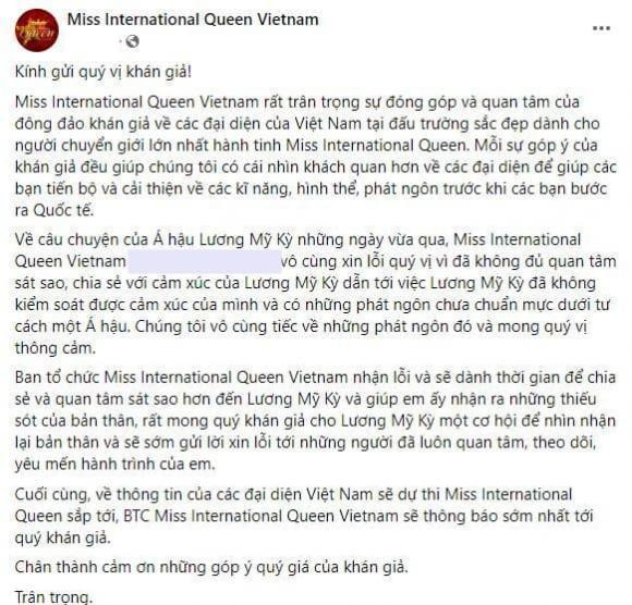 Trước phản ứng gay gắt của netizen, mới đây, trên fanpage Miss International Queen Vietnam đã lên tiếng về ồn ào của người đẹp chuyển giới. Phía BTC thay mặt cô nàng gửi lời xin lỗi đến quý khán giả, đồng thời BTC đưa ra lời cam kết sẽ dành thời gian để quan tâm Lương Mỹ Kỳ sát sao hơn, giúp cô nhận ra những thiếu sót của bản thân.