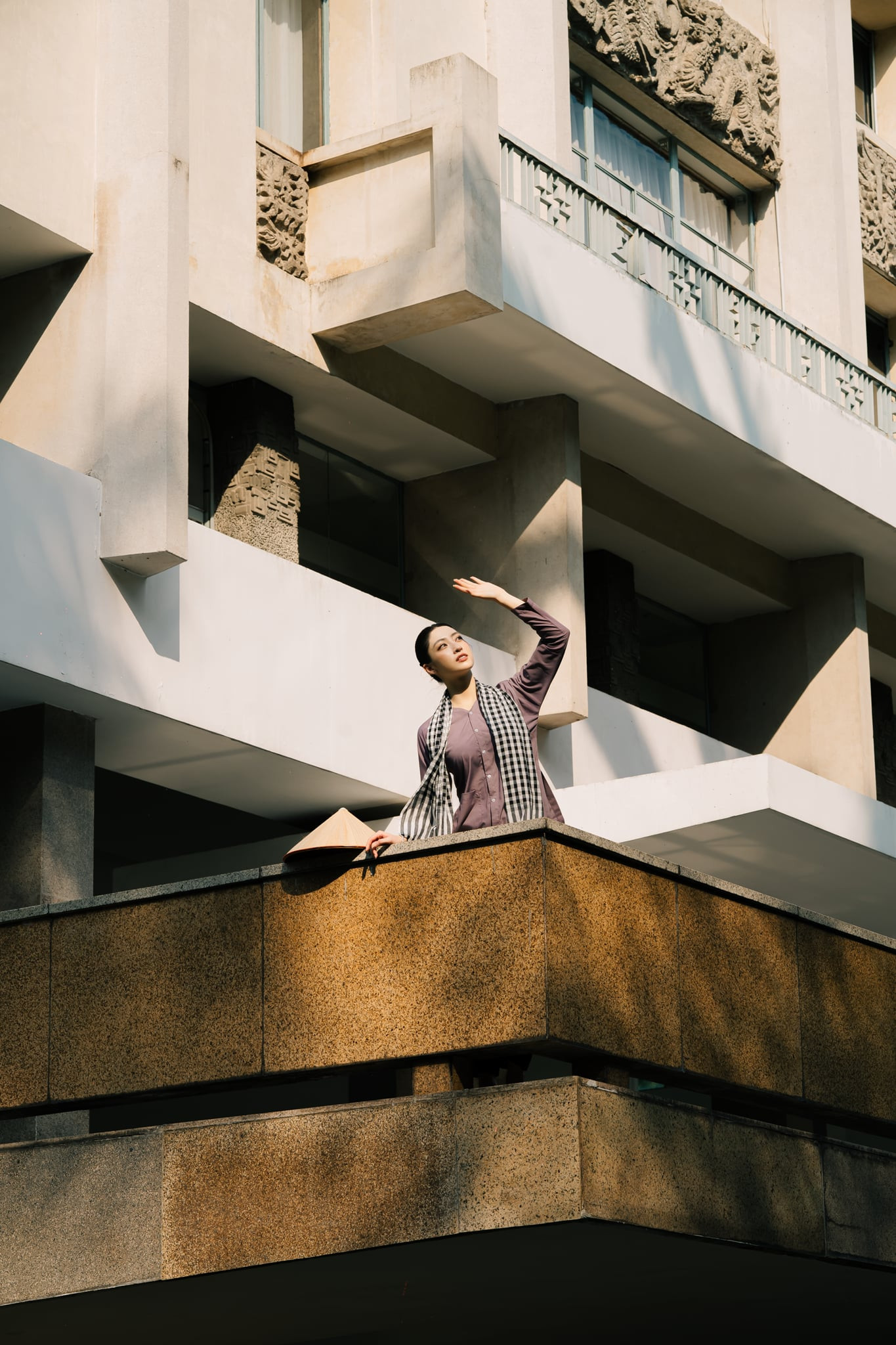 Sự xuất hiện của Lương Thùy Linh trong bối cảnh tại Dinh Độc Lập, với áo dài trắng và áo bà ba, là sự giao thoa giữa quá khứ và hiện tại.