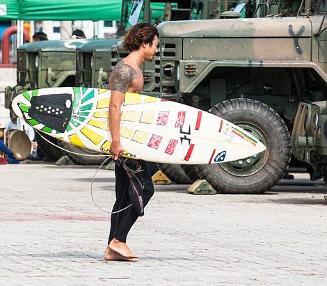 Một người đàn ông cùng ván tiến ra biển và đi ngang qua xe quân sự tại khu phi quân sự giữa Triều Tiên và Hàn Quốc. Nhiều người thích mạo hiểm đã tìm đến vùng biển Hàn Quốc thuộc DMZ để thử sức cùng những con sóng. Quan hệ giữa Bình Nhưỡng và Seoul luôn trong tình trạng căng thẳng vì hai bên mới chỉ đạt lệnh ngừng bắn năm 1953 mà chưa ký hiệp ước hòa bình.