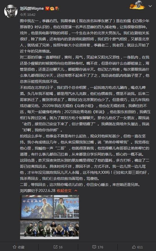 "Tôi không rõ thời gian chính xác, lý do anh ấy ra đi. Tôi chỉ biết khóc và trách móc anh ấy. Sau này, tôi sẽ đến mộ Đông Nhiên, mắng anh ấy tại sao lại ra đi như vậy. Đông Nhiên, em nhớ anh, kiếp sau chúng ta vẫn là anh em" - Lưu Nhuế Lân viết.
