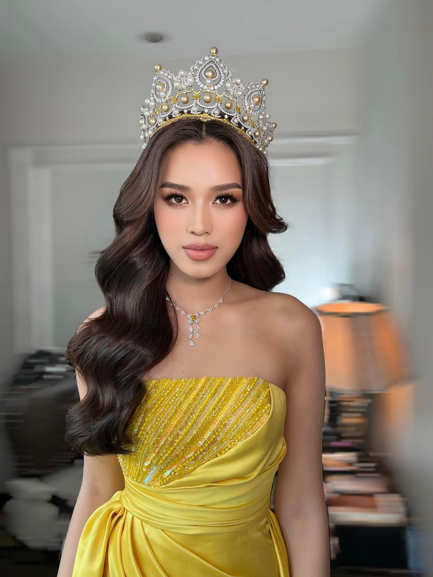 Quả thực đây là lựa chọn rất tinh tế, khéo léo của Đỗ Thị Hà khi váy áo tông vàng càng giúp tôn lên chiếc vương miện danh giá, khiến nàng hậu càng thêm xinh đẹp lộng lẫy. Chưa kể mặc đồ cùng màu vương miện cũng là xu hướng được nhiều nàng hậu khác yêu thích.
