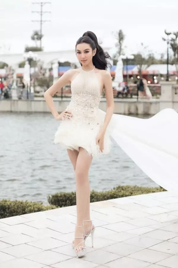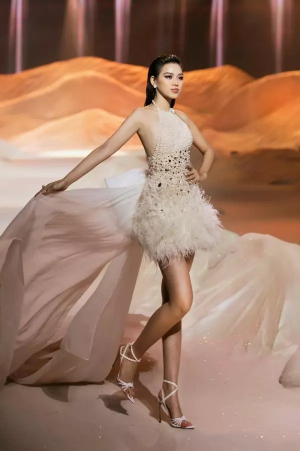 Một lần khác, hai nàng hậu lại khoe đôi chân dài miên man trong bộ váy ngắn cổ yếm đính lông vũ rất cầu kỳ. Tuy nhiên, xét về tổng thể thì Đỗ Thị Hà được khen nhiều hơn nhờ chọn đôi sandal quai mảnh, giúp đôi chân thêm thanh thoát. Trong khi đó, mẫu sandal mà Thùy Tiên đi lại có phần đế thô, khiến cô nhìn hơi nặng nề.