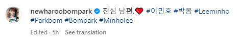 Ngày 27/9, Park Bom đăng một bức ảnh của bản thân và Lee Min Ho lên Instagram cá nhân, đính kèm chú thích: "Người chồng thực sự của đời tôi".