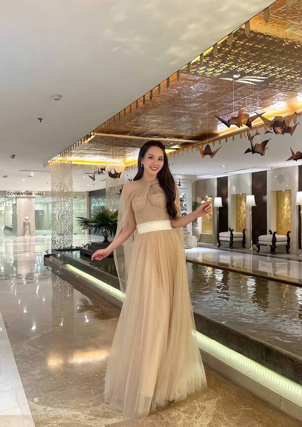 Thiết kế màu nude mang phong cách dạ hội nhẹ nhàng, mang đến cho Hoa hậu Mai Phương vẻ đẹp dịu dàng, ngọt ngào.