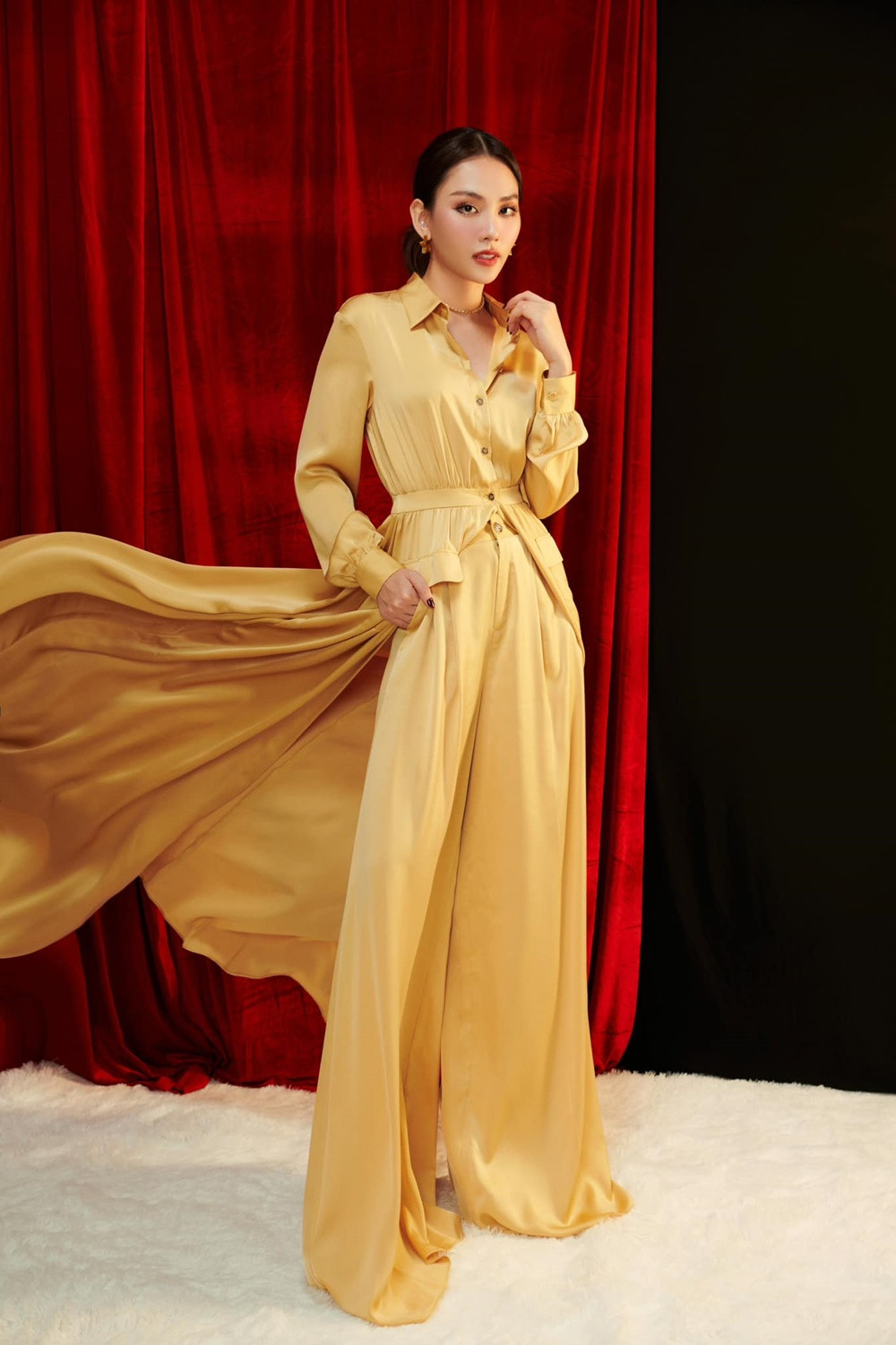 Ngày thứ 3, Hoa hậu Mai Phương diện một set suit cách điệu có tông màu vàng gold. Set đồ khá rườm rà nhưng vẫn là một thiết kế thanh lịch, dịu mắt.