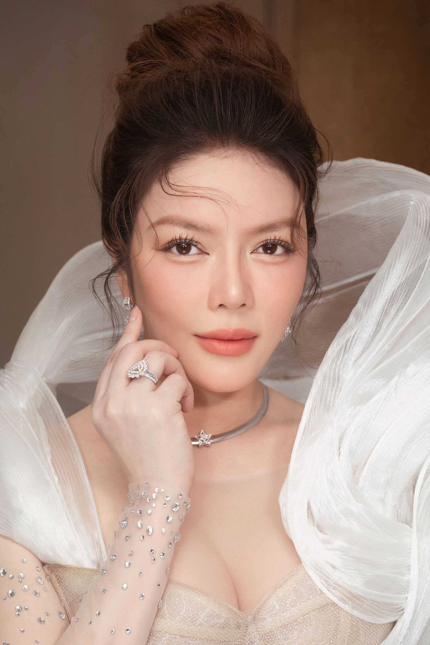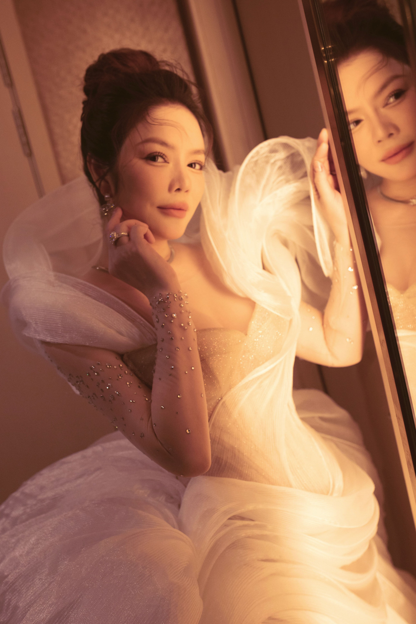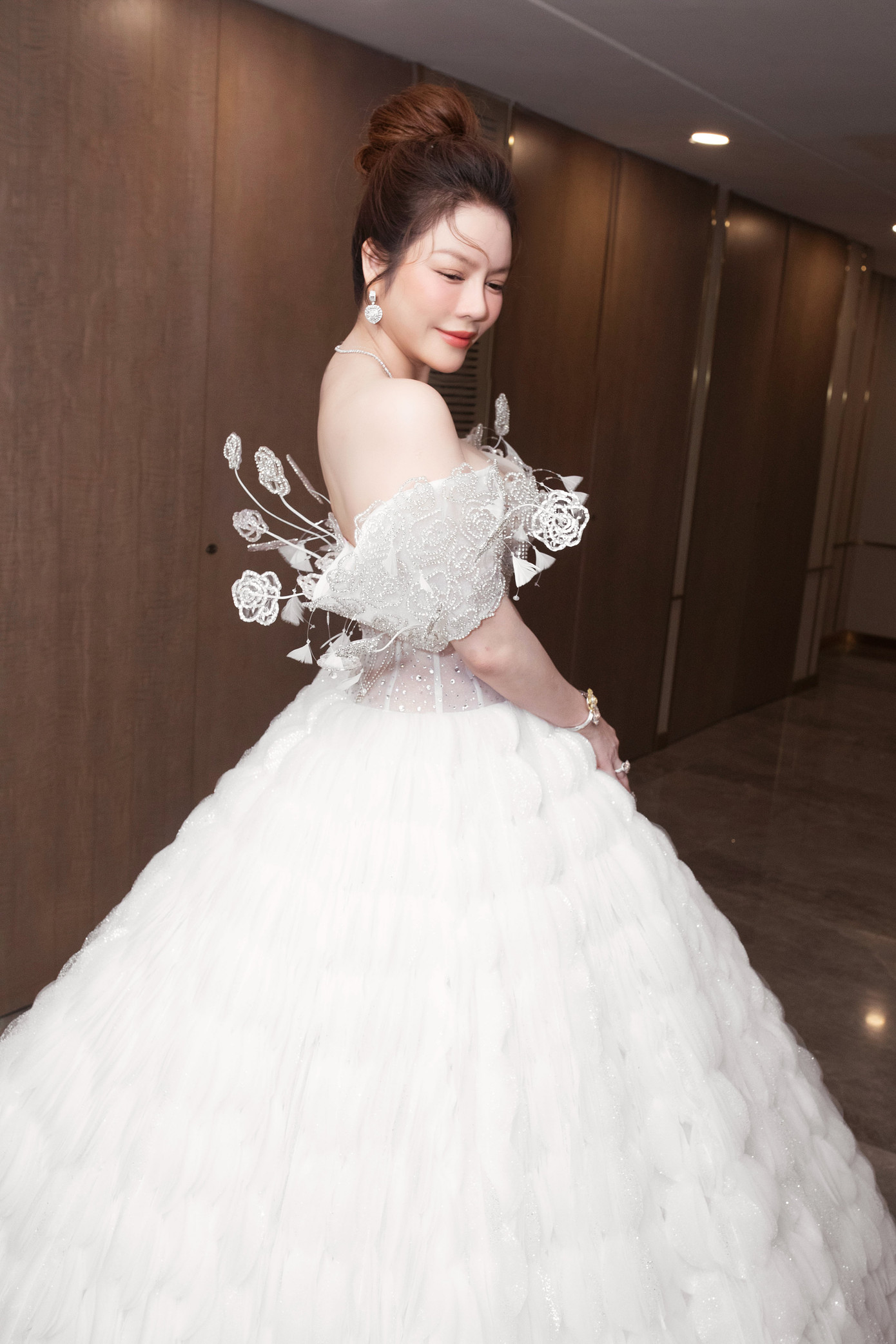 Váy cưới siêu nhẹ và bồng bềnh, tinh tế tạo nên 'cơn sốt' trong thời gian gần đây. Phần thân váy đi khối hoạ tiết đá pha lê tạo hình thu gọn vòng eo và tôn lên khuôn ngực người mặc. Cô không quên hoàn thiện bằng set trang sức kim cương 1 tỷ đồng gồm nhẫn, hoa tai, vòng tay, dây chuyền, trong đó đắt nhất là vòng tay lấy ý tưởng từ trái tim.