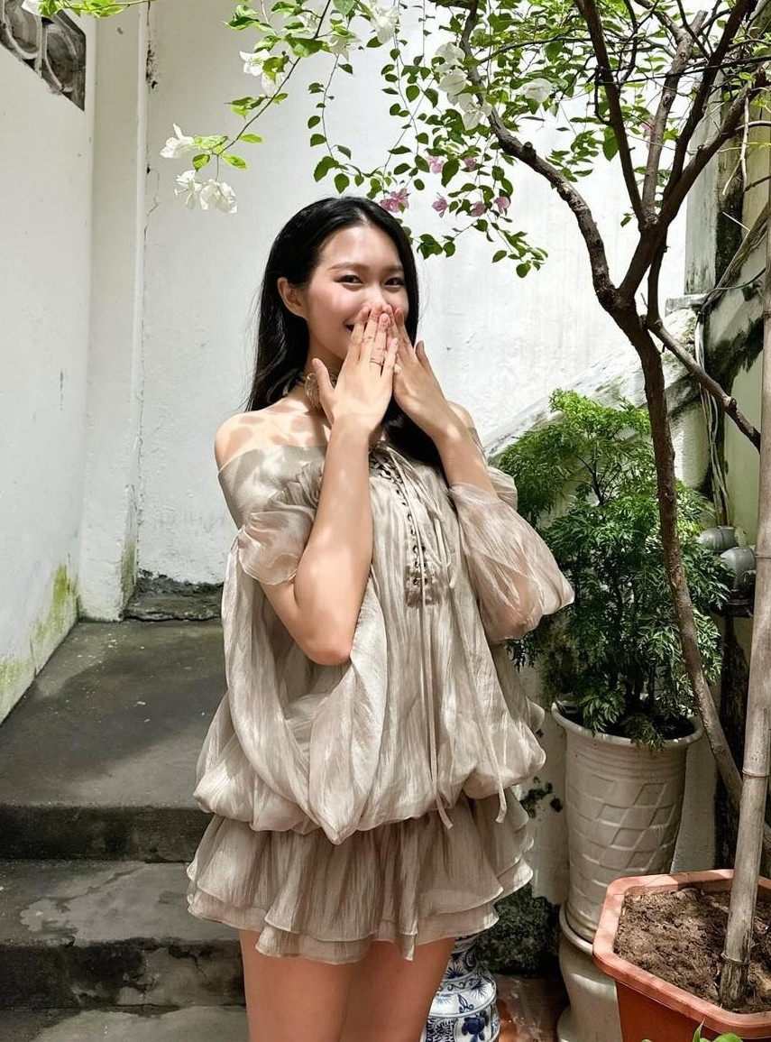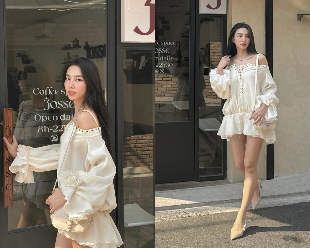 Bộ váy này cũng từng được Hoa hậu Thùy Tiên diện đi chơi với bạn bè. Thùy Tiên cũng thả tóc xõa, trang điểm nhẹ nhàng cho hợp với vẻ nữ tính điệu đà của trang phục. Chỉ khác là Miss Grand International 2021 không đeo vòng cổ gắn bông hồng vải như Doãn Hải My mà thôi.