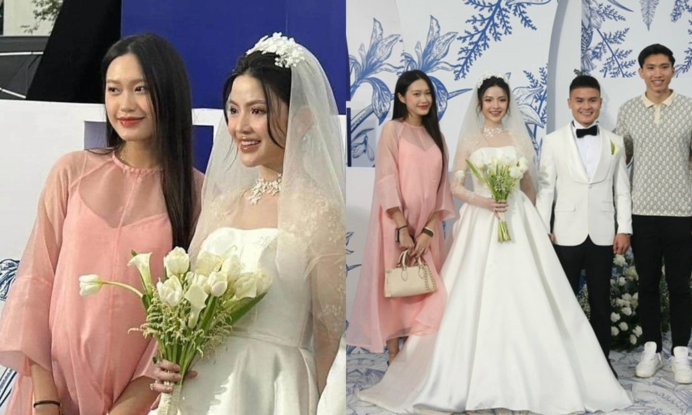 Trước đây, bà xã Đoàn Văn Hậu cũng có màn "đụng hàng" bất phân thắng bại với Tăng Thanh Hà. Khi tới dự lễ cưới của Quang Hải và Chu Thanh Huyền, Doãn Hải My chọn bộ váy màu hồng pastel nền nã với kiểu dáng suôn rộng, giúp cô giấu được bụng bầu và rất hợp với thần thái nhẹ nhàng nữ tính của cô.