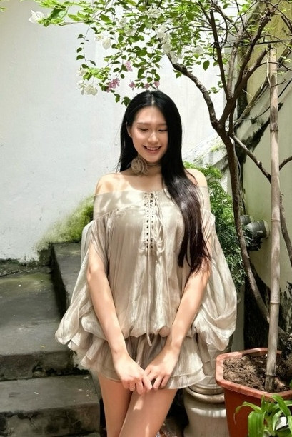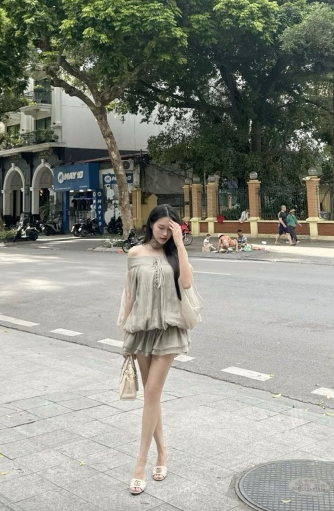 Mới đây, cô khoe loạt ảnh thả dáng trên phố trong mẫu váy điệu đà của một thương hiệu thời trang trong nước. Thiết kế phía trên trễ vai, phía dưới siêu ngắn giúp Doãn Hải My khoe được vóc dáng mảnh dẻ của mình.