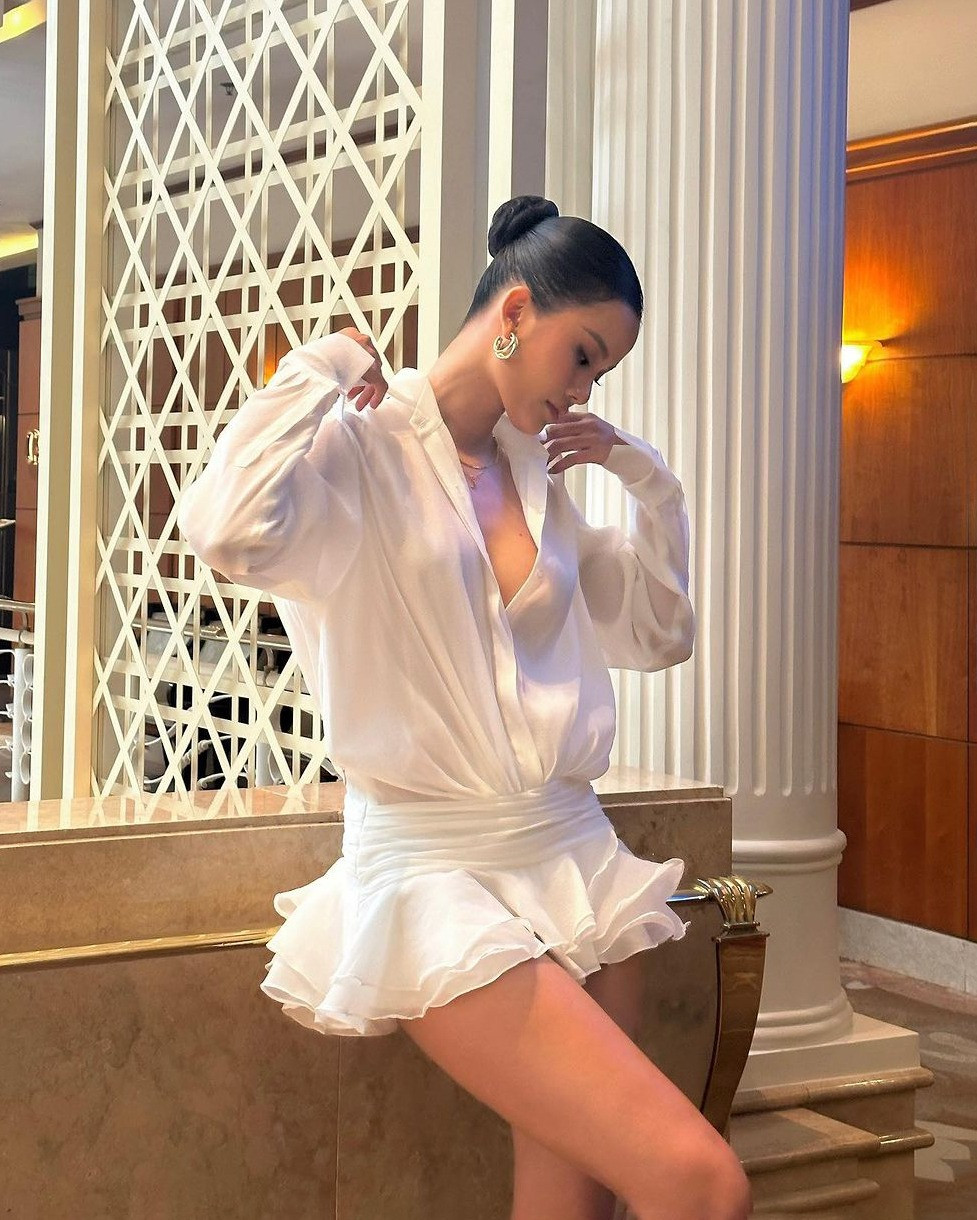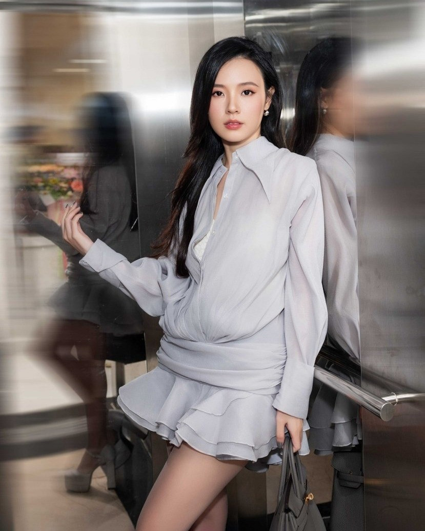 Á hậu Quỳnh Châu cũng mặc thiết kế này trong một sự kiện nhằm khoe đôi chân dài miên man.